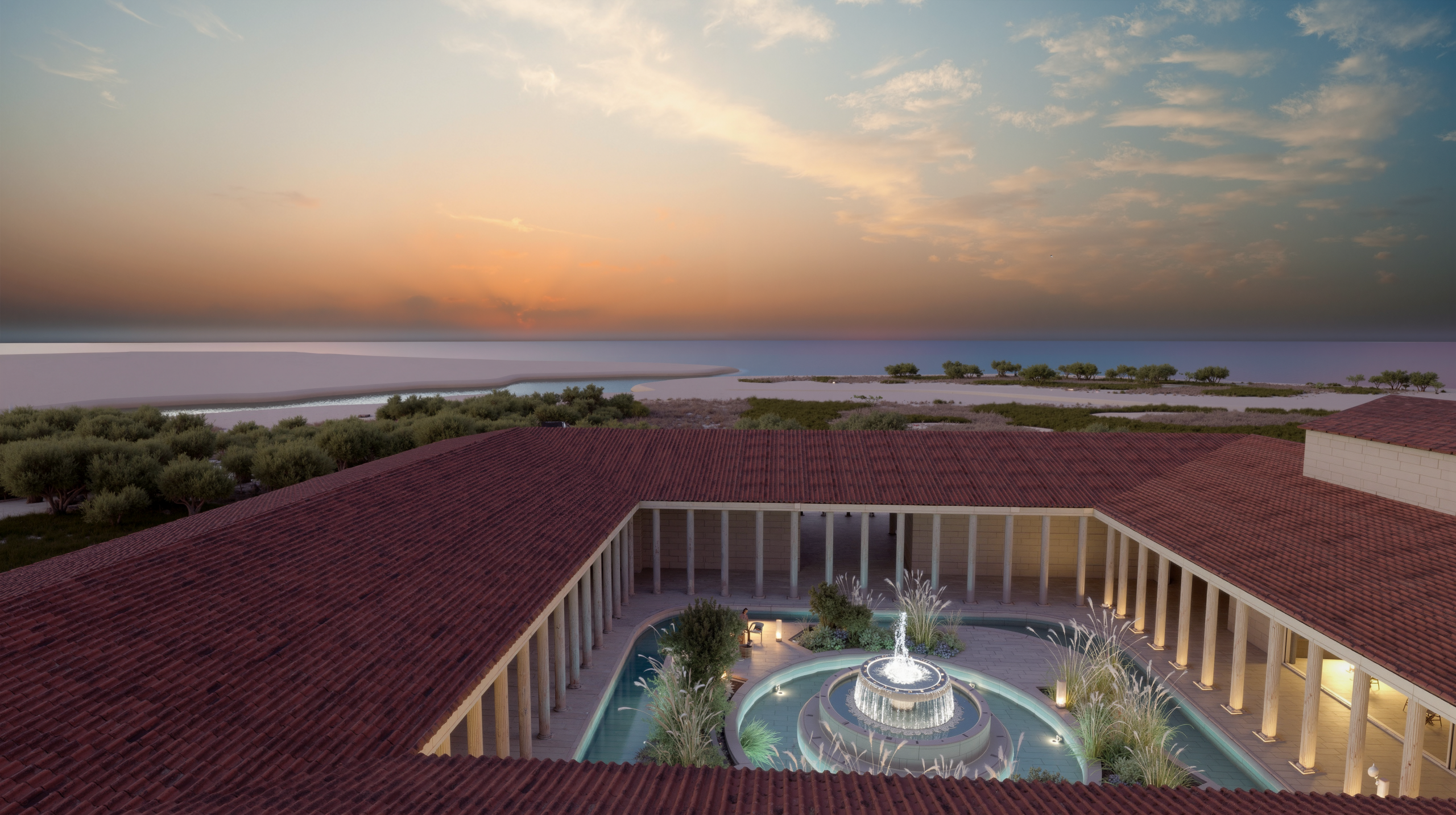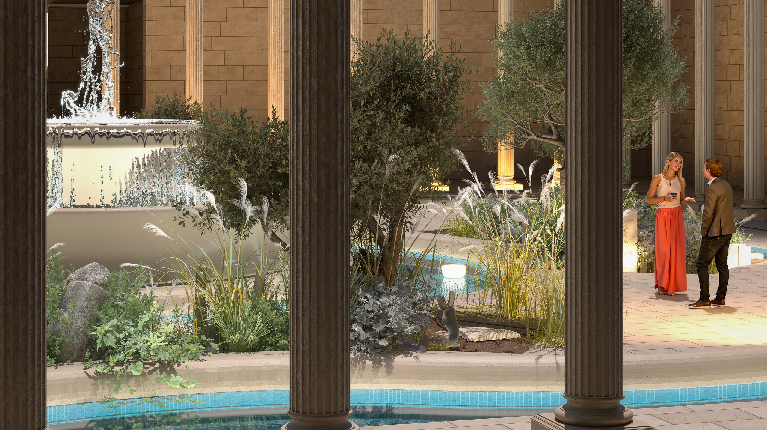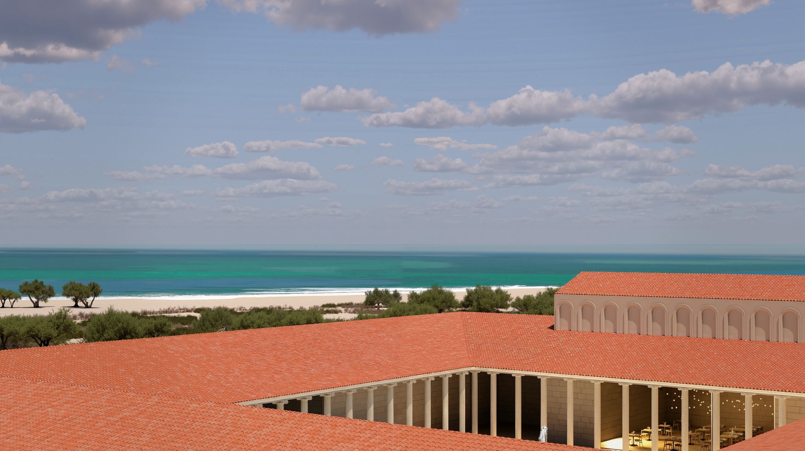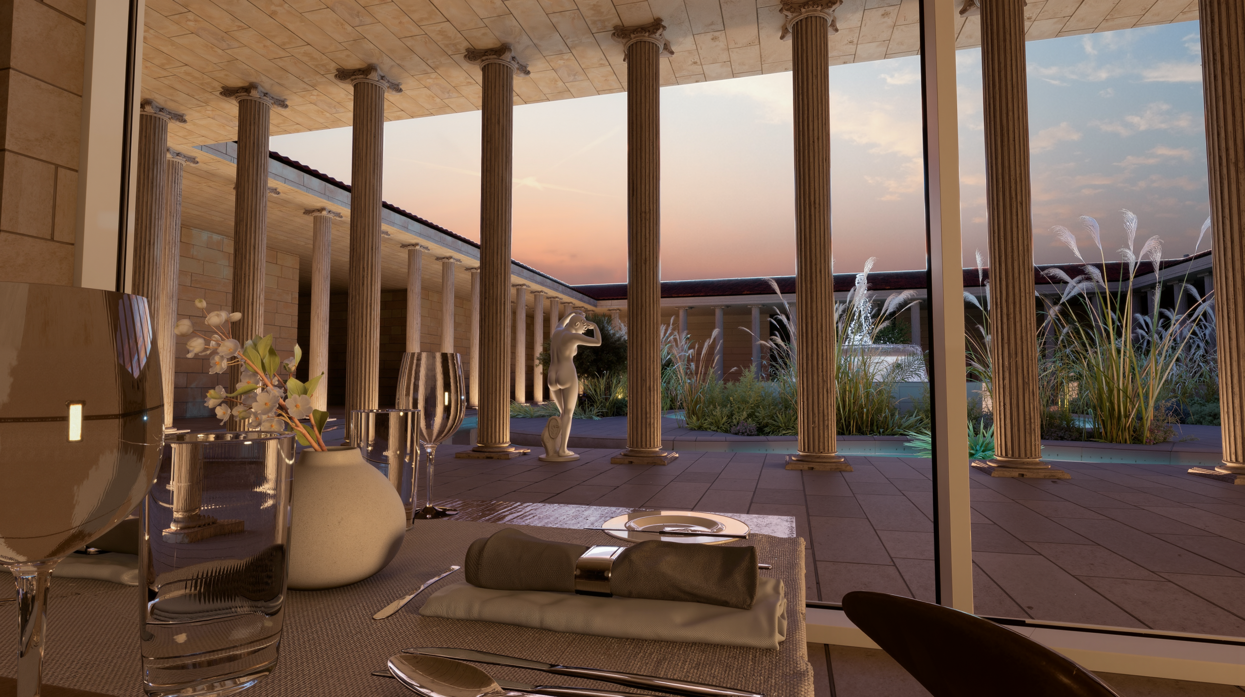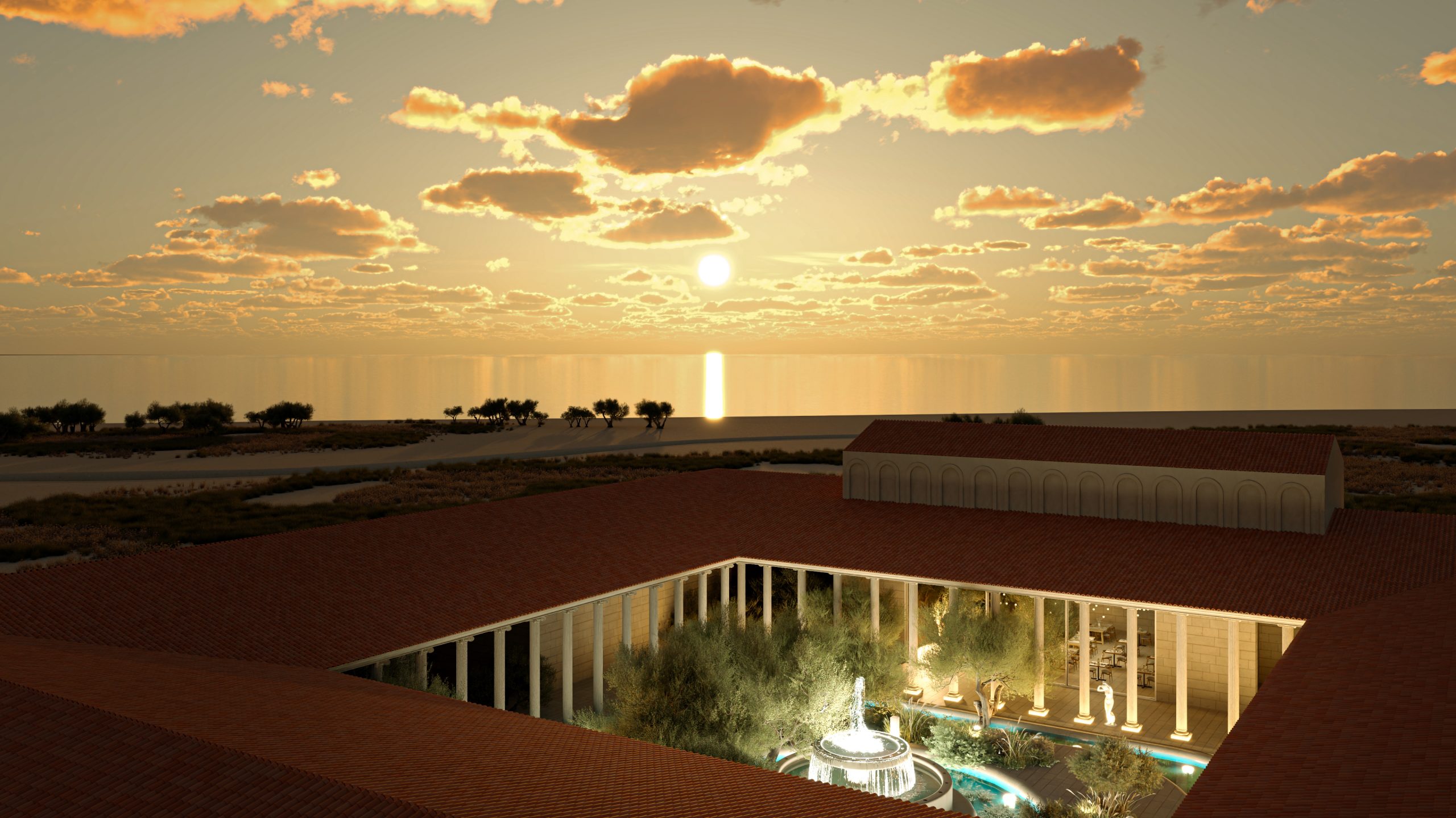 At the heart of the domain, we are rebuilding what is believed to be the first hotel in history, based on its original architectural plan. This iconic building will serve as a hub for gatherings, featuring a conference center, spa, gym, and a restaurant serving authentic Greek cuisine.